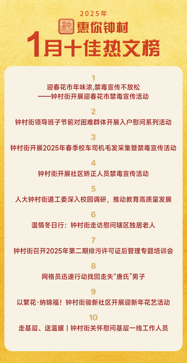 1月份"惠你钟村"南方号聚焦民生关切,累计发布55篇原创报道。从禁毒宣传到慰问行动,从校园调研到文艺活动,通讯员用鲜活的镜头与灵动的笔尖,捕捉着钟村街人民的美好生活景象,展现了街道服务的多样性与温度。让我们一起走进钟村街道的精彩时刻>>